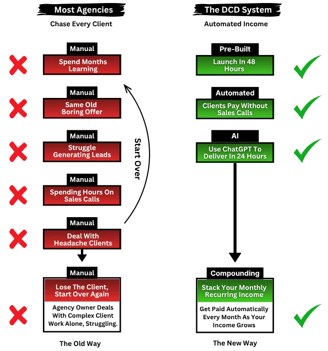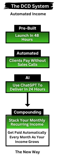 The DCD System is for Two types of people. Firstly, anybody who has been looking for a simple, step-by-step system to build a side-income, that comes in every month automatically. They don't want sales calls, they want a system that operates in the background and doesn't have a huge learning curve. They want to use Chat-GPT to their advantage and get ahead while they still can. The second type of person is somebody who has tried to launch a Marketing Agency but became sick and tired of the constant client work, feeling burnt out and would like a more automated, easy-to-deliver system where they can focus on building the lifestyle they dreamt of.