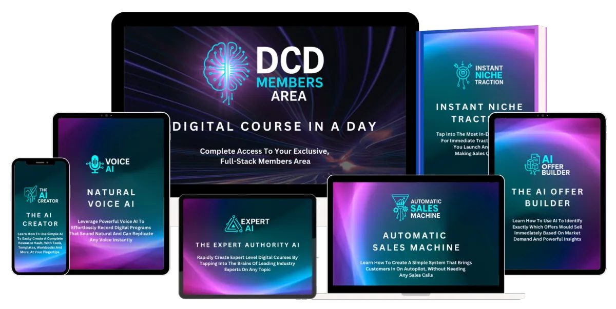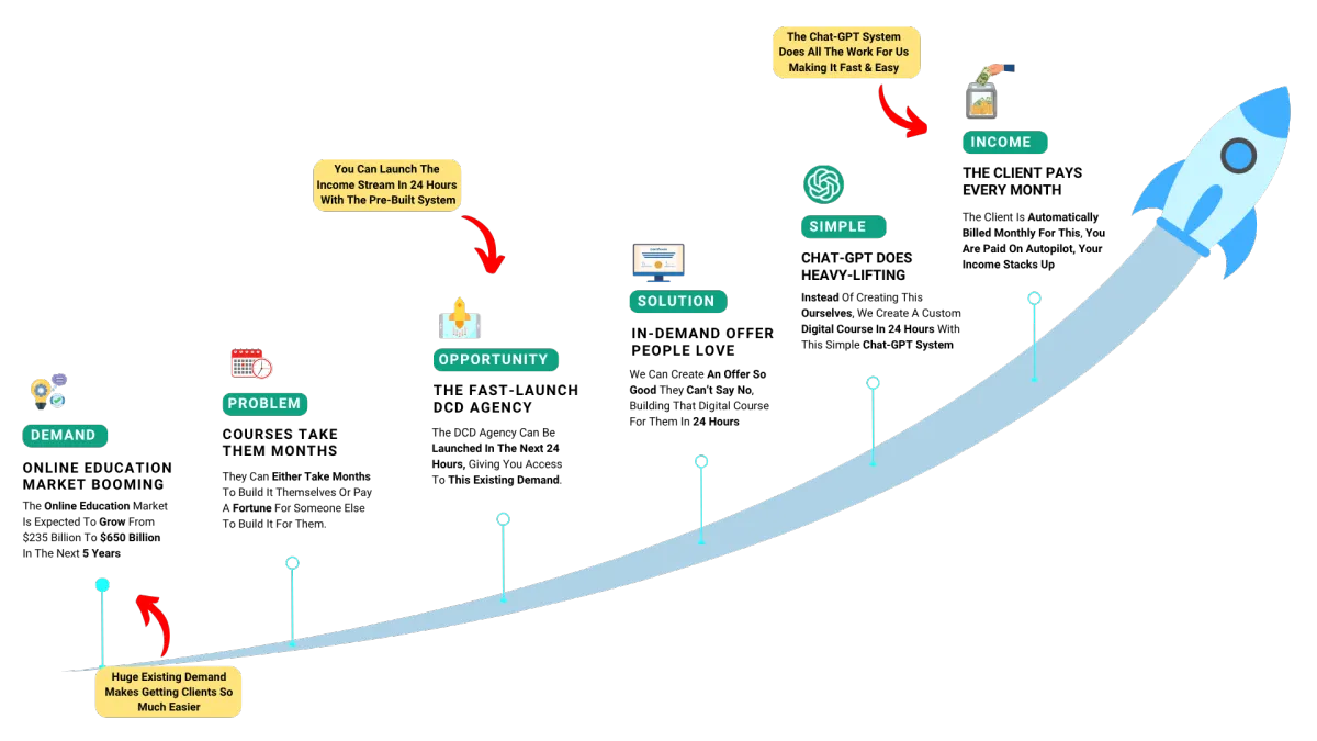 The Digital Course in a Day System is a systematic process which allows you to quickly build up monthly recurring revenue, without learning complex skills or having to take sales calls, using AI. This is not a fad. This is one of the fastest growing industries right now and it's time to take advantage o fit. The demand is huge and The DCD System allows you to use Chat-GPT and build expert-level Digital Courses for businesses, in 24 hours. Once you use The DCD System, you will be able to create these Digital Courses easily and quickly using AI, with business owners paying you monthly for this. They pay THOUSANDS and spend at least 6 months creating Digital Courses. Whereas with us and The DCD system, they can have it built for them in a single day. This gives you an in-demand offer, with huge market demand, allowing you to build up your monthly income quickly, using Chat-GPT to do the heavy-lifting for you.