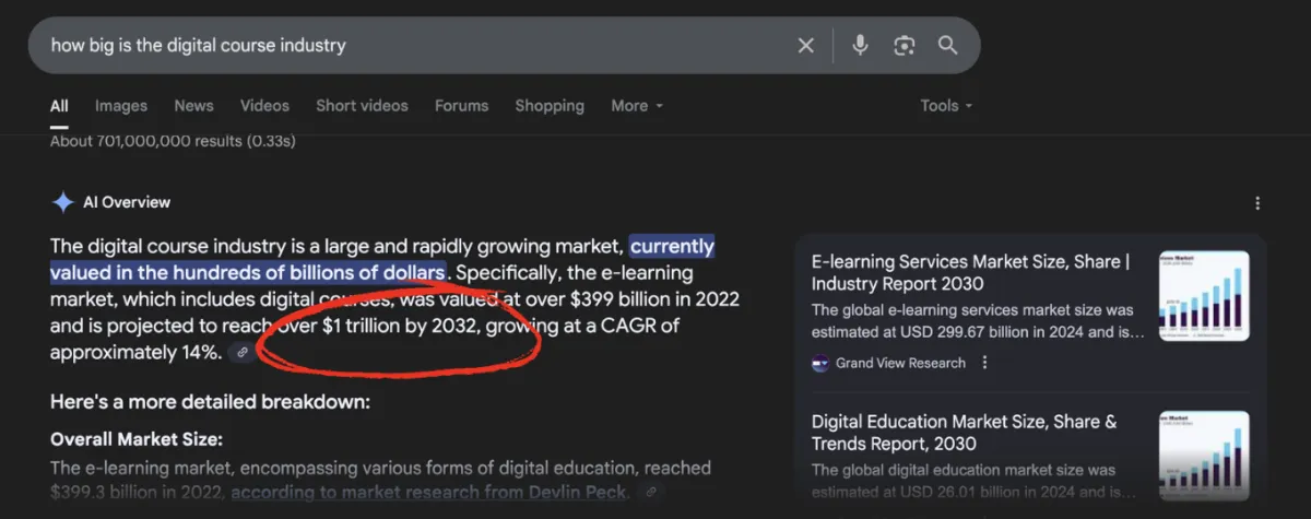 Generally, the other stuff out there teaches you "ideas". They show you the possibility of doing something, but it always has a big learning curve, requires high pressure, doesn't have much proven, immediately obvious, demand and you have to build everything yourself. This means it takes forever to get started. With The DCD System, you have proven demand. A quick search on Google will show you this, with this market expected to grow rapidly over the next 5-7 years. You are also getting a pre-built system, with your own website ready to put your name on and launch. You can rapidly build an expert-level course for yourself, or for a business and start selling tomorrow. Our pre-built AI Systems, leveraging Chat-GPT, take all of the complexity away for you, keeping it fast and simple. This is why you can launch so quickly.